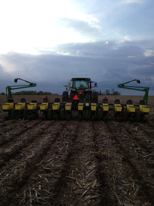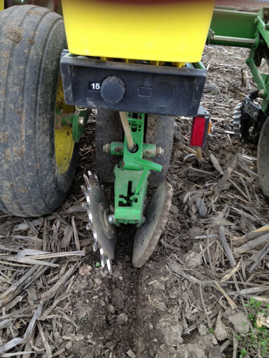 Here’s the planter row up close. The left and right packer wheels are made for different soil conditions. That’s why one is spiked and one isn’t.