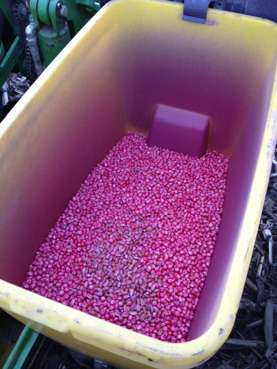 Here’s the corn seed in the seed box. It’s pink because it has insecticide on it to keep the bugs from eating it until it can sprout and emerge.