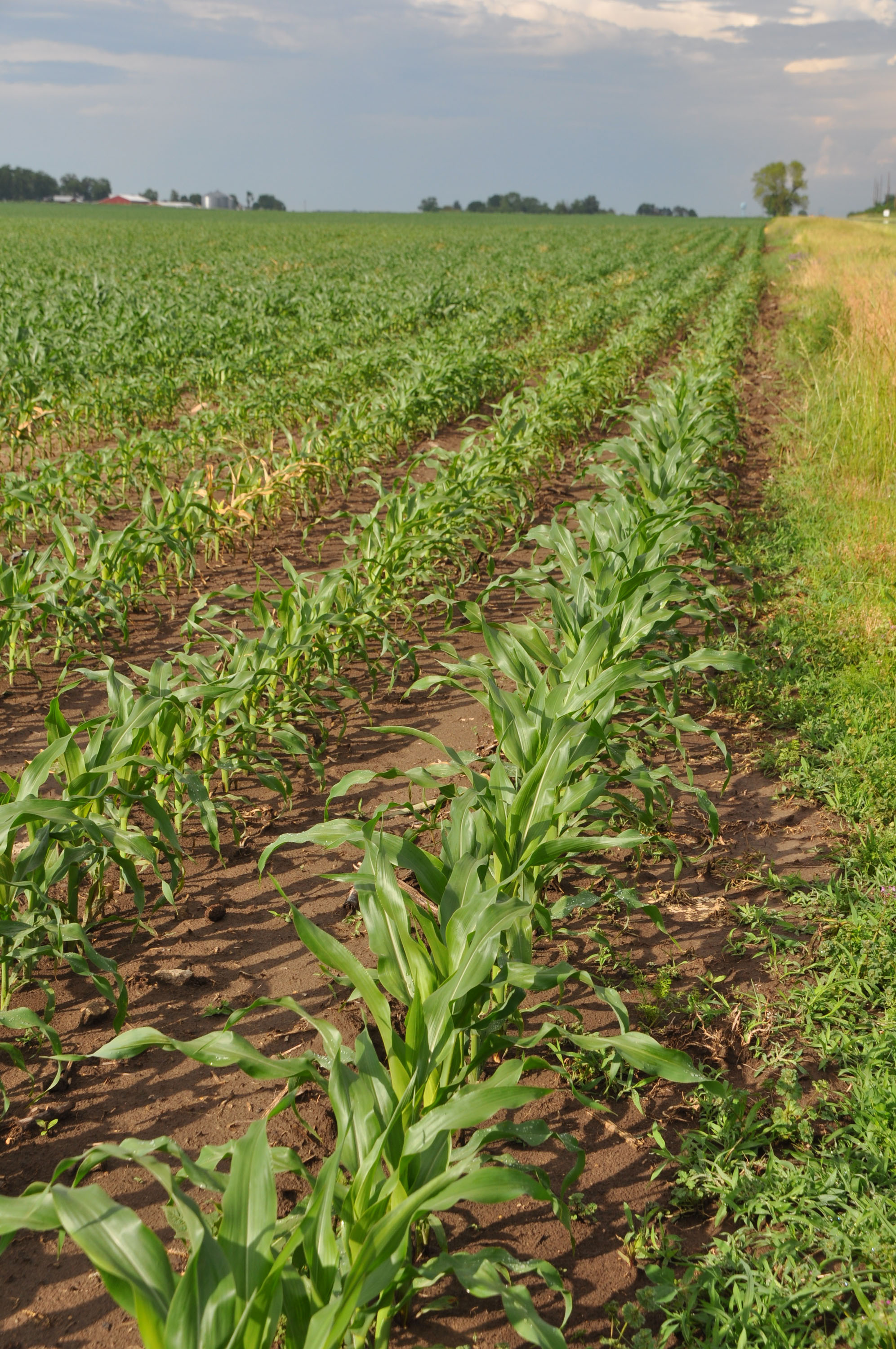 These are the end rows of corn in the field. The little bit of brown on the leaves is “burn” from some of the fertilizer. It won’t hurt the corn and you won’t even notice it when it grows a bit taller.