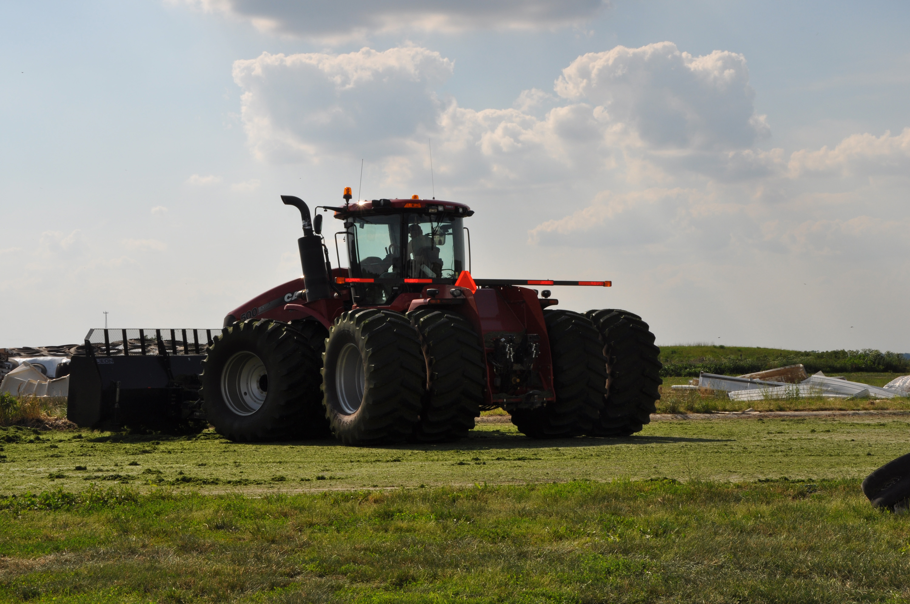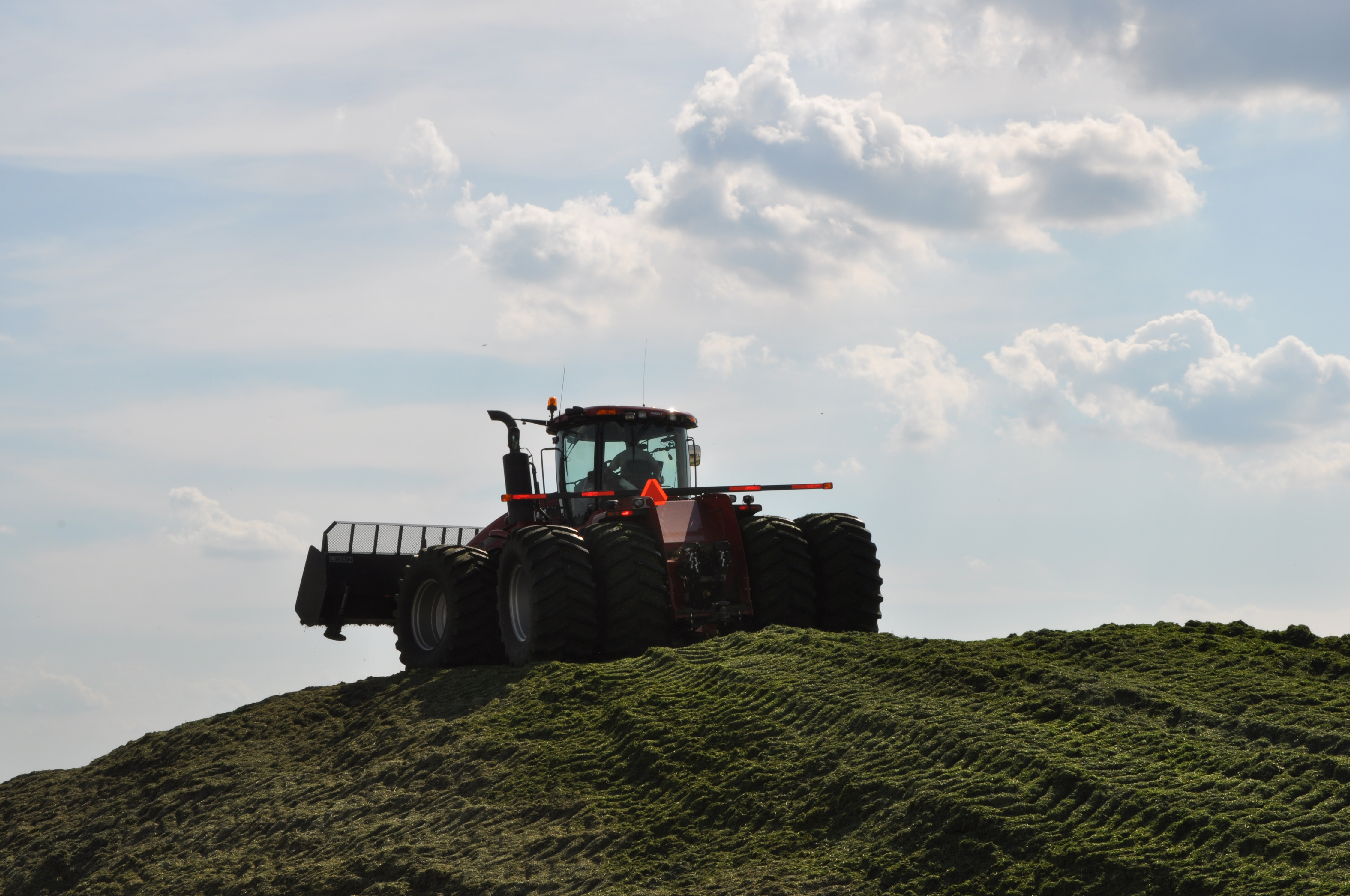 This is the packing tractor. He will push the pile of alfalfa with his blade on the front and the tires and weight of the tractor will compress it to drive the air out and pack it tight so it will ferment over time and store properly.