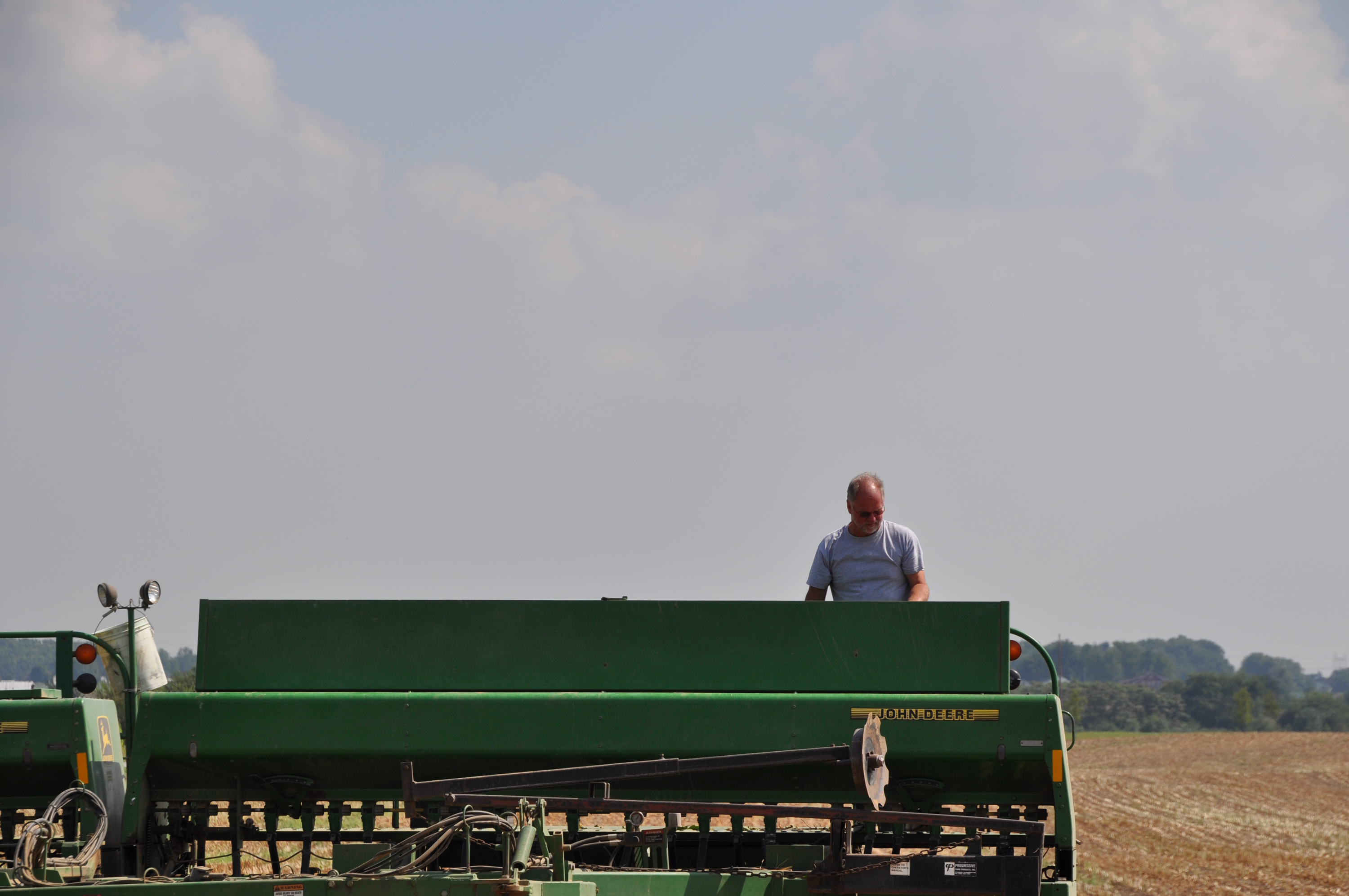 On some of our highly erodible ground Richard plants a cover crop for the winter so the dirt won’t run off. He will kill the crop before planting corn late next spring. He’s just gotten the drills filled with seed and is ready to go.