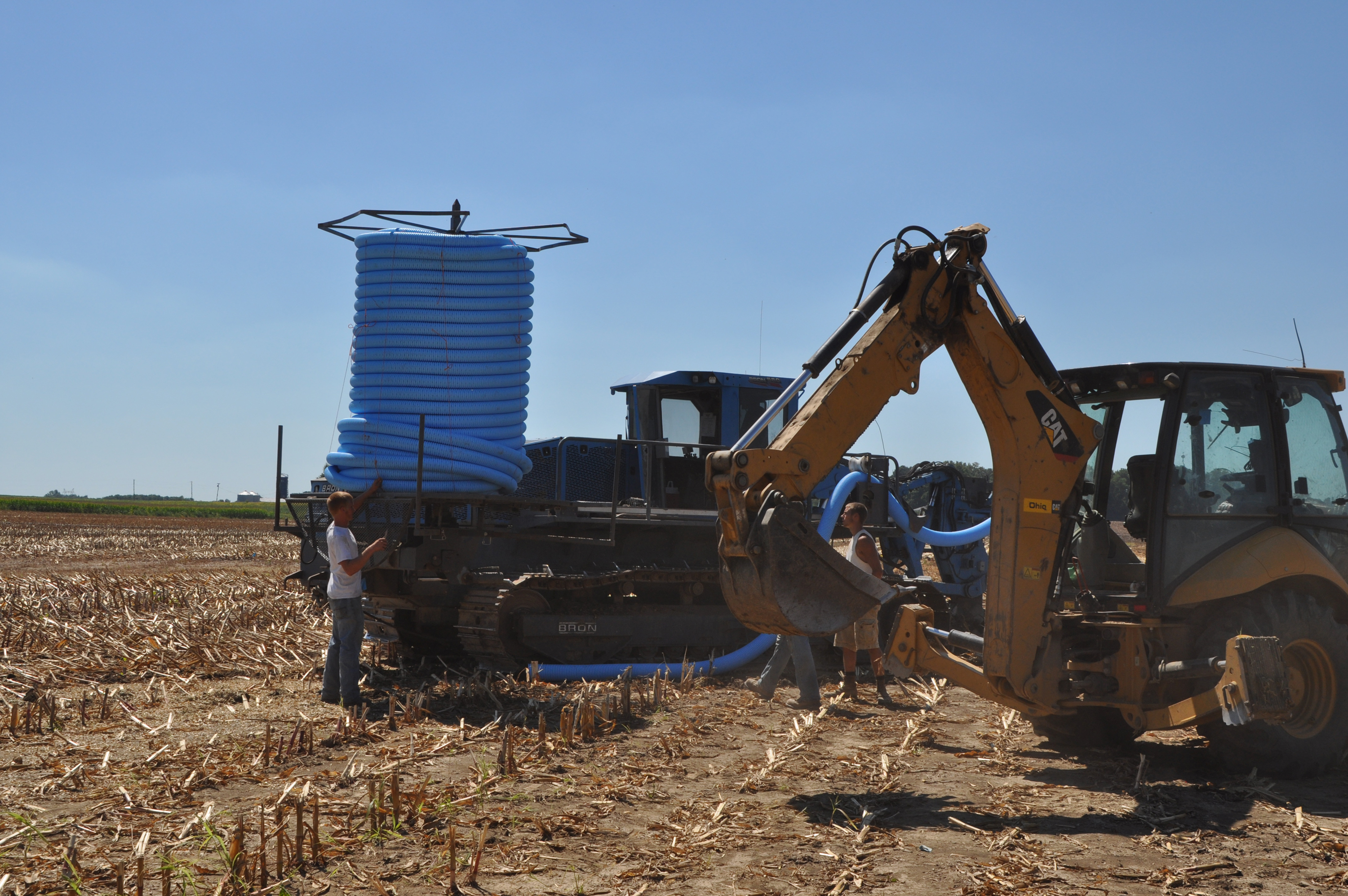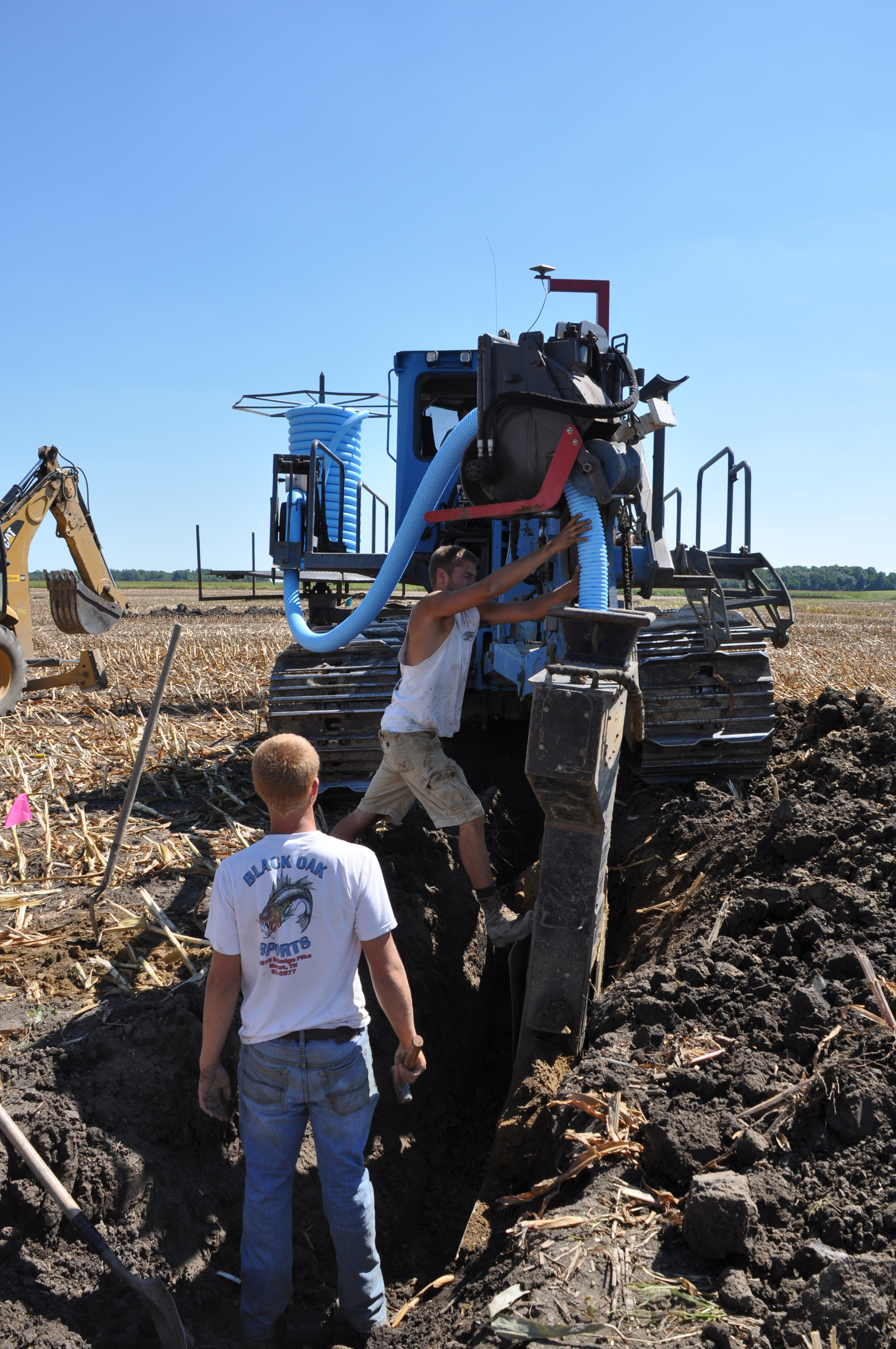 The tile machine driver now starts to plow the tile into the ground. See the yellow bubble on top of the red pole? That’s the GPS/laser to keep the tile “on grade” in the field.
