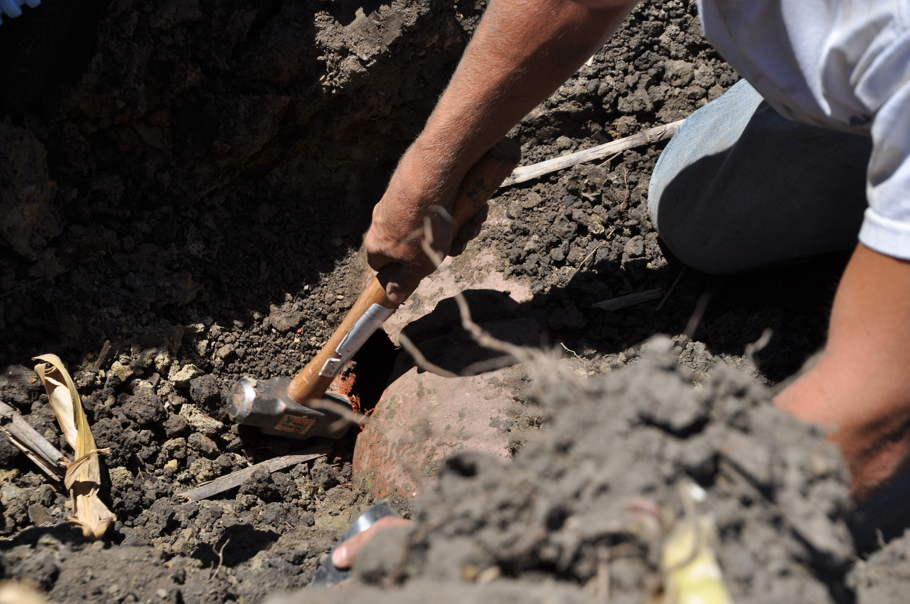 Many of the old mains were dug in years and years ago by hand. We only have a pencil sketch map of where they are, if we have any map at all, so most of the digging is hunting, pecking and trying to find them without breaking them.
